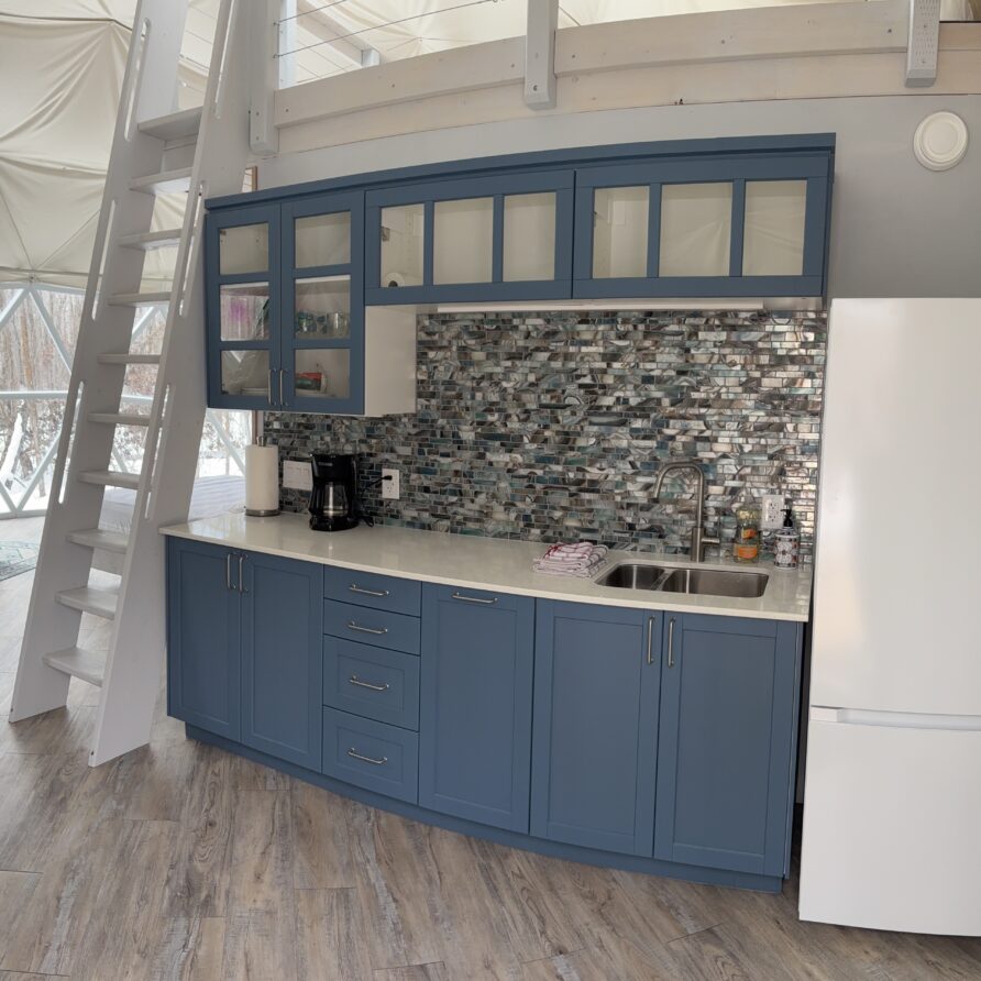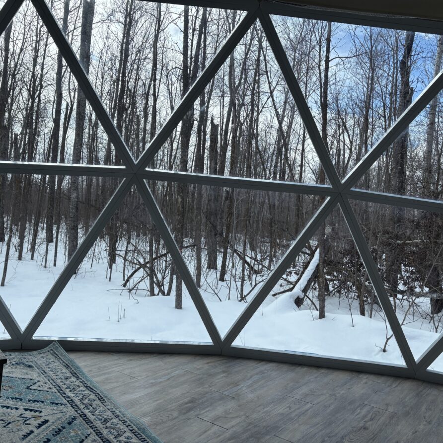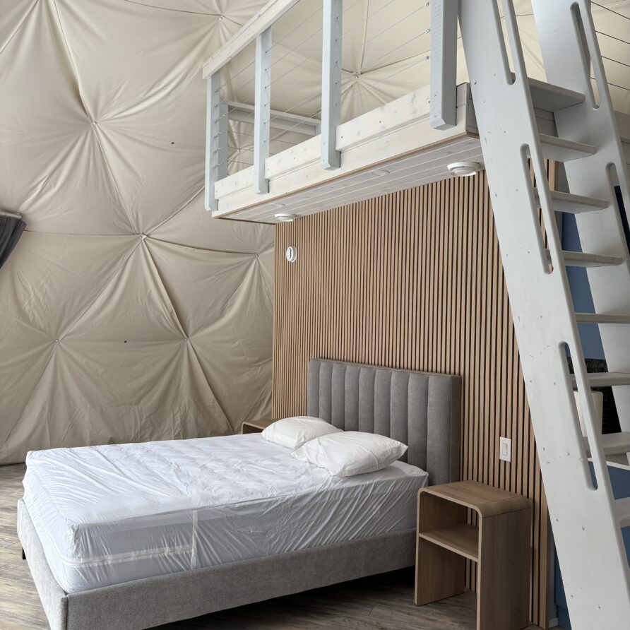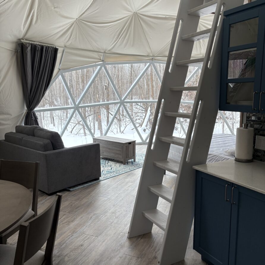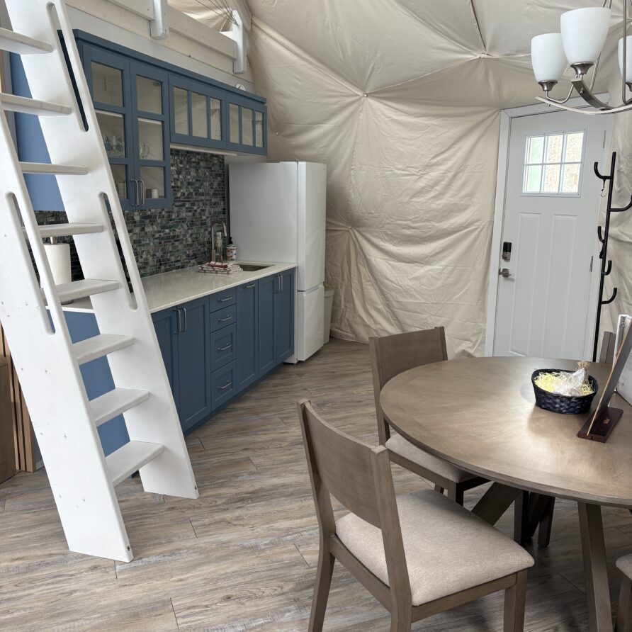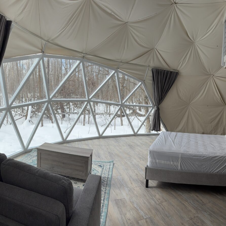 Spacious on-grid dome that is wheelchair accessible, with heat, A/C, 2 queen beds, kitchenette, BBQ, fire pit & jetted hot tub.