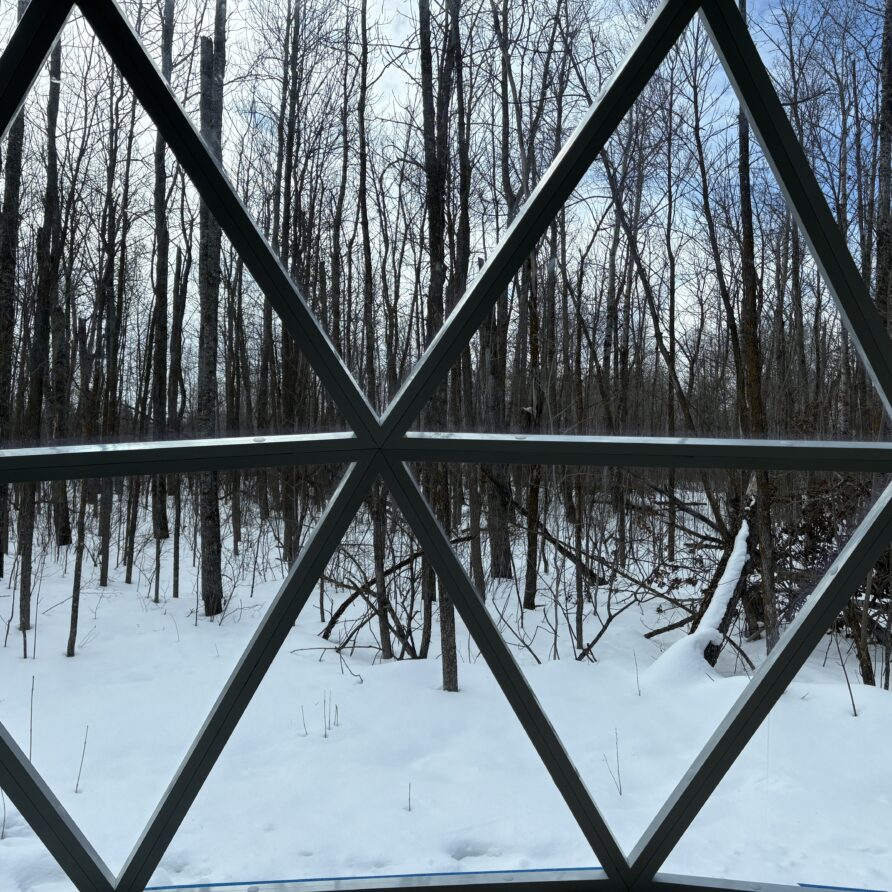 Cozy off-grid forest dome with panoramic views, 2 queen beds, private bath, kitchenette, BBQ, fire pit & wood-fired hot tub.